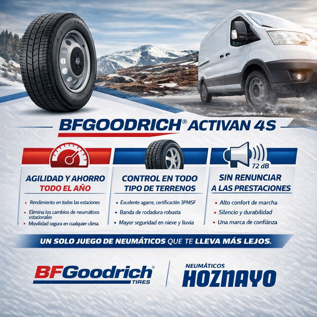 En Neumáticos Hoznayo trabajamos soluciones para empresas que buscan durabilidad y precio competitivo, como BFGoodrich Activan 4S para vehículos comerciales.